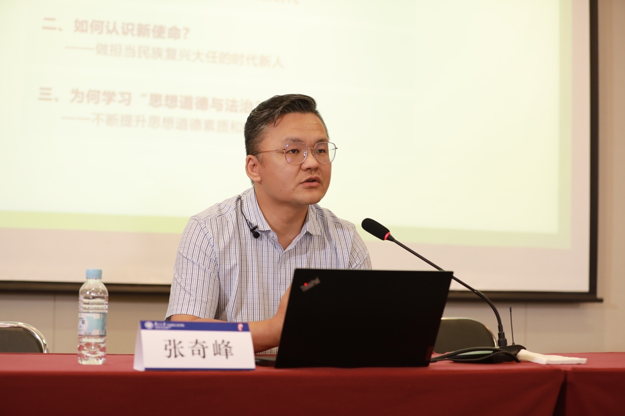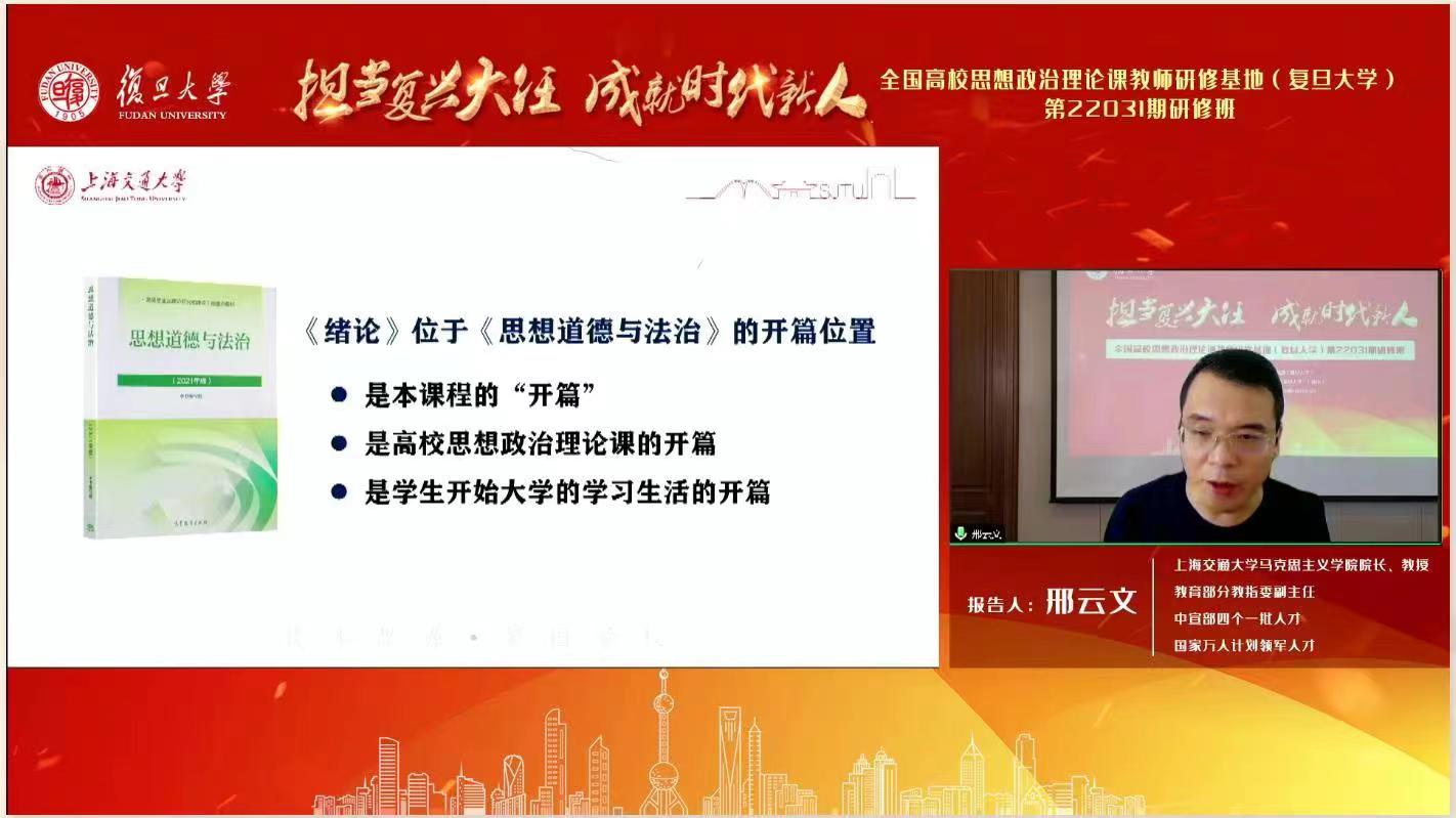 919日上午,上海交通大学韩漫h 院长,教育部“形势与政策”和“当代世界经济与政治”分教指委副主任委员,中宣部“文化名家”暨“四个一批”理论人才,国家“万人计划”哲学社会科学领军人才邢云文教授以《〈思想道德与法治〉绪论课教学的思考》为题,结合自己多年从事《思想道德与法治》教学的经验和体会,对讲好开篇第一课做了深入的阐释。