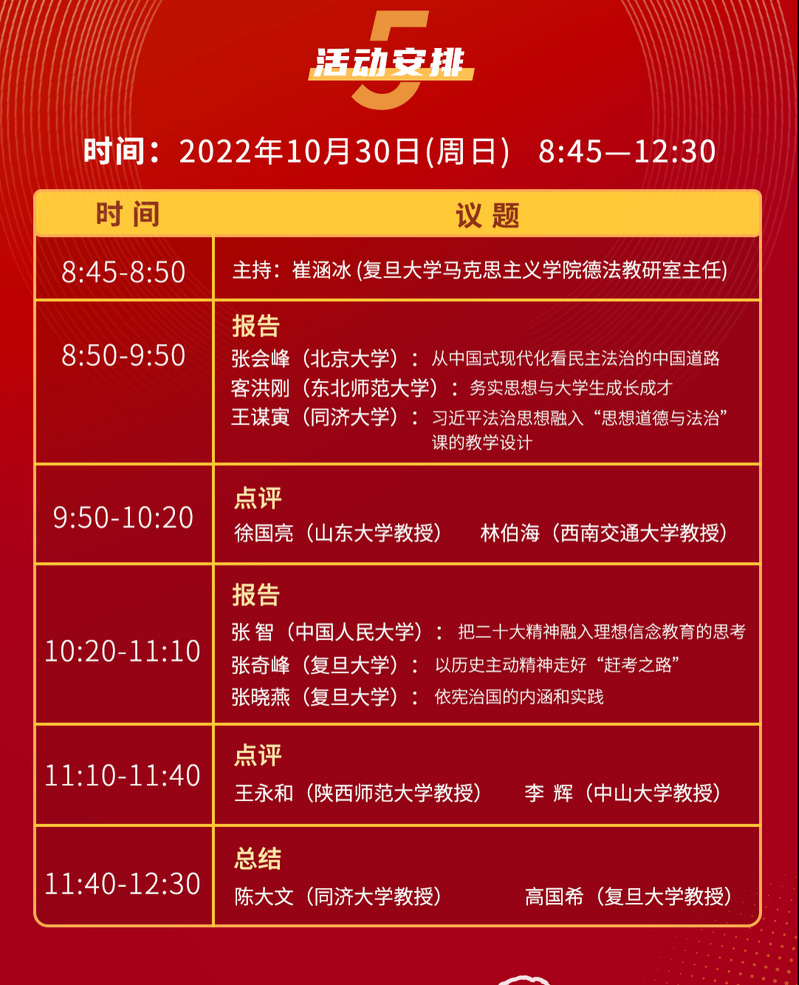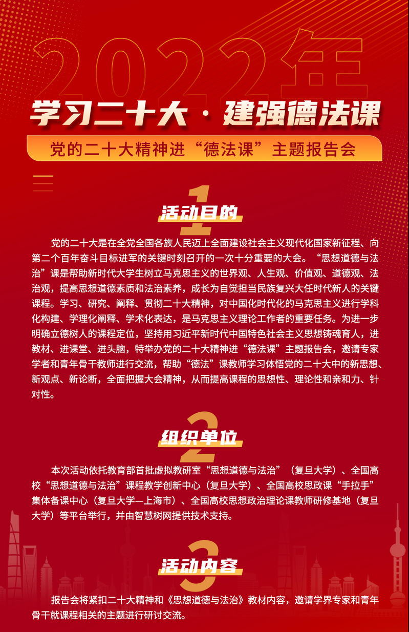 党的二十大是在全党全国各族人民迈上全面建设社会主义现代化国家新征程、向第二个百年奋斗目标进军的关键时刻召开的一次十分重要的大会。以党的二十大精神为引领,为进一步明确立德树人的课程定位,坚持用习近平新时代中国特色社会主义思想铸魂育人,进教材、进课堂、进头脑,韩漫h “思想道德与法治”虚拟教研室联合本校主持的全国高校“思想道德与法治”课程教学创新中心、全国高校思政课“手拉手”集体备课中心、全国高校思想政治理论课教师研修基地等平台,于2022年10月30日上午举办党的二十大精神进“德法课”主题报告会。