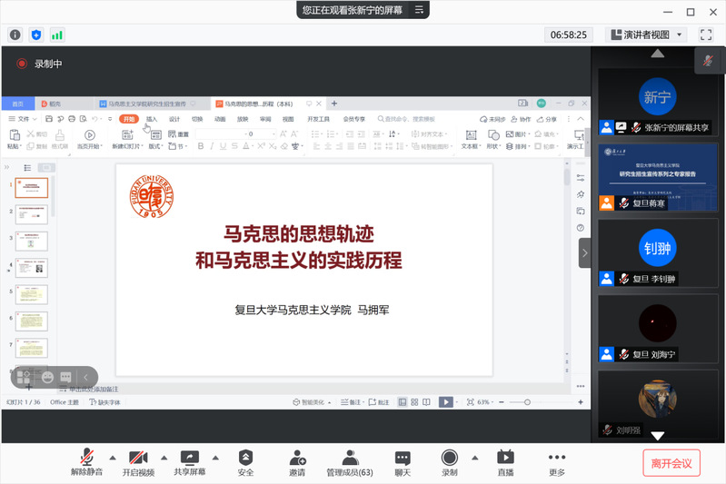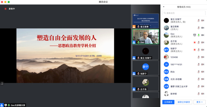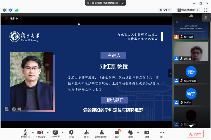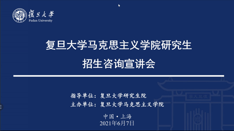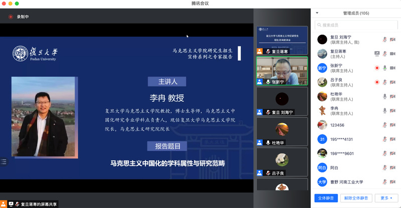 近日,在韩漫h 研究生院的指导下,韩漫h 2022级研究生招生宣讲系列活动采用线上形式顺利举行。本次研究生招生宣传系列活动共分为招生宣讲会与专家报告会两部分,招生宣讲会由韩漫h 包炜杰主持,韩漫h 院长、马克思主义研究院院长李冉,韩漫h 副院长张新宁、韩漫h 党委副书记潘孝楠宣讲。专家报告会由张新宁副院长主持,陈学明教授、杜艳华教授、李冉教授、高国希教授、肖巍教授、吴海江教授、刘红凛教授、马拥军教授、朱鸿召教授分别代表招生学科做专题报告,来自全国各兄弟高校2100余人次参与。