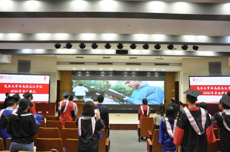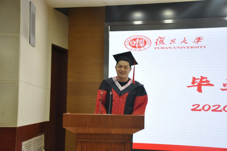 2020届博士研究生代表严哲文同学、2021届硕士毕业研究生代表田甜同学和2021届博士毕业研究生廉国强同学分别作为毕业生代表发言。他们或者学术的高峰上勇敢攀登,用诚挚热情的态度为坚定的理想信念做注脚;或者走向基层就业岗位,以牺牲奉献的精神将勇担责任使命落到实处。即将踏上新征程的他们,怀着对学院同样的依依惜别之情,展现出传承和弘扬“团结、服务、牺牲”的复旦精神以及勇敢迎接未来挑战的信心和决心。