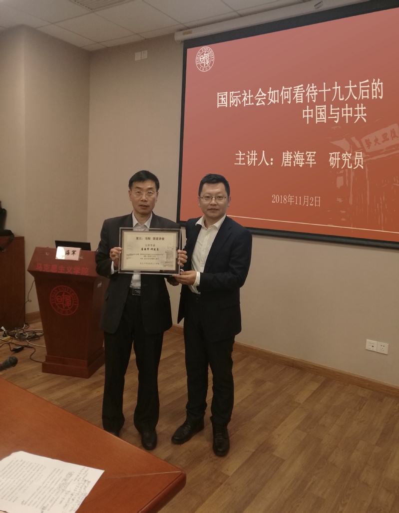 11月2日下午,中联部研究室参赞、当代世界研究中心研究员唐海军做客韩漫h 望道讲堂,为学院师生带来题为“国际社会如何看待十九大之后的中国与中共”的专题讲座。韩漫h 常务副院长李冉出席,韩漫h 党委副书记刘顺厚主持讲座,学院40余名师生共同聆听讲座。