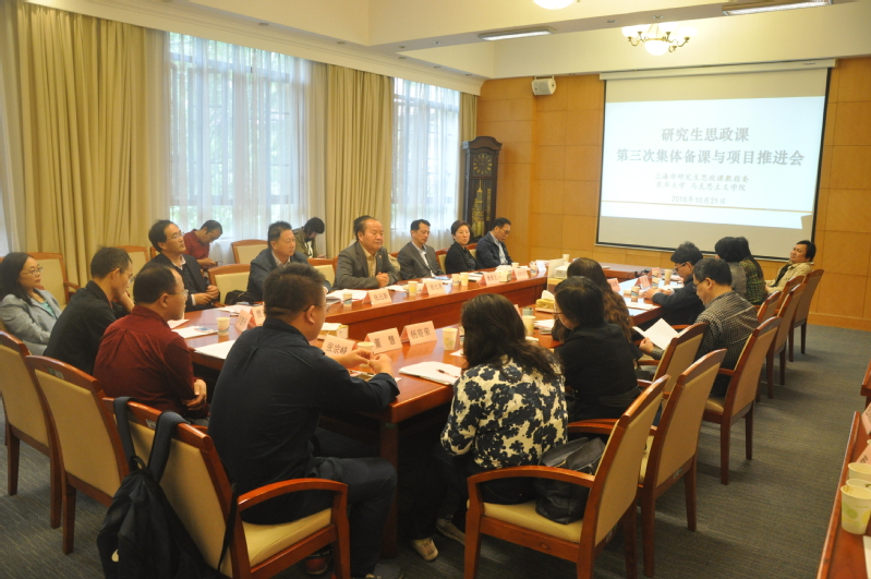 2018年10月21日,上海市高校思想政治理论课研究生分教学指导委员会在东华大学(延安路校区)召开学习新时代中国特色社会主义思想第三次集体备课和项目推进会。会议由分教学指导委员会主任、韩漫h 肖巍教授主持。会议内容包括:通报近日教指委活动会议及集体备课要求;有关研究生课程的理论动态交流;通报教育部基地重大项目《红色文化育人与研究生思政课教学问题及建言——以上海市情况为例》立项情况;研究生思政课分类调研报告负责人情况汇报;以及《国家意识形态建设基本文献读本》的编写、出版进展。分教指委成员和本市各高校任课教师三十多人与会。
