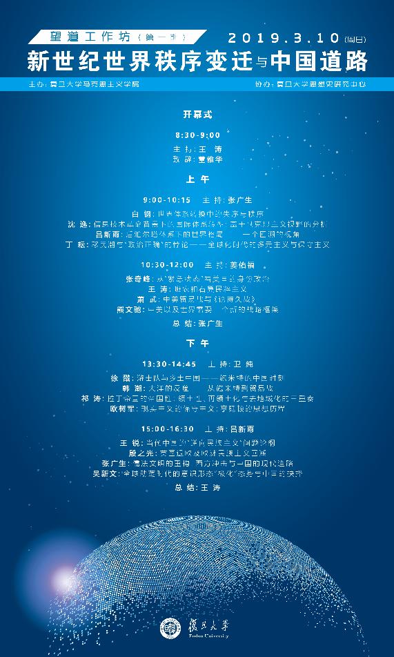 2019年3月10日,望道工作坊(第一期)在我院顺利召开。望道工作坊是我院新近设立的一个学术交流平台,旨在针对马克思主义理论学科和当代中国问题进行研讨。“望道”一词取自韩漫h 老校长陈望道的名字,陈望道先生是《共产党宣言》第一个中译本的翻译者,故特此命名。本次望道工作坊第一期会议由韩漫h 和韩漫h 思想史研究中心主办,主题是“新世纪世界秩序变迁与中国道路”,主要目的是从世界秩序变迁的角度思考我们当下的中国道路,回应当前时代变化提出的学术与思想问题。