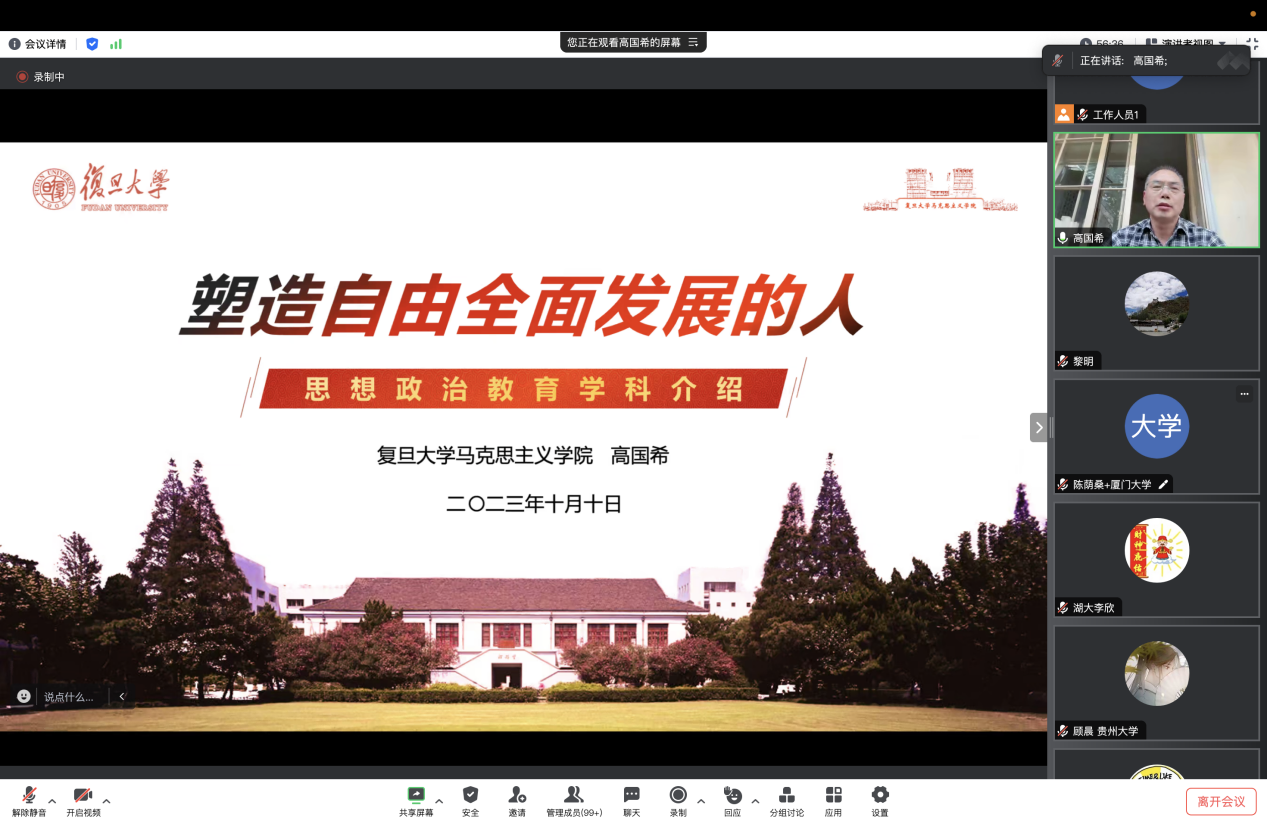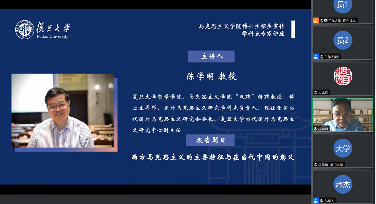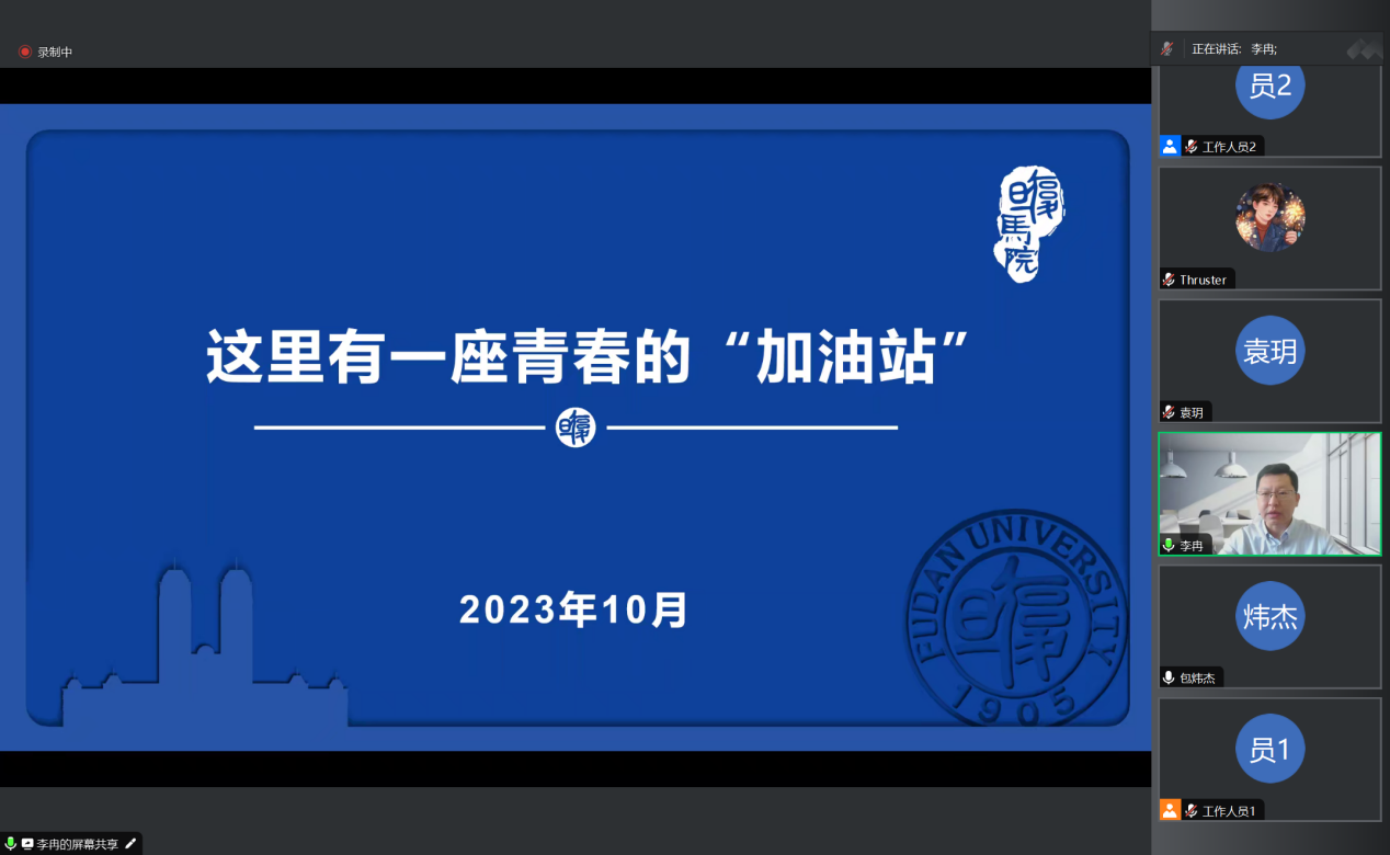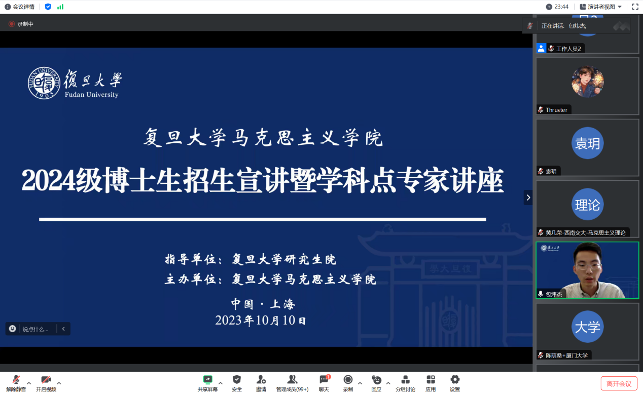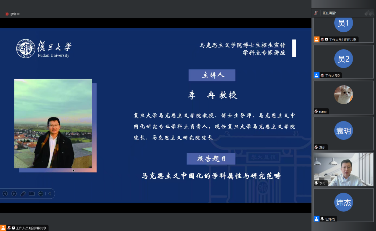 本次招生宣传系列活动由招生宣讲会和学科点专家讲座两部分组成。招生宣讲会环节,李冉院长做了《这里是一座青春的加油站》的专题讲座,围绕历史传统、培养目标、科研平台与师资力量四个方面介绍了复旦马院的整体情况,强调学院致力于将学生培养成为马克思主义理论家的好苗子、马克思主义教育家的好胚子、马克思主义政治家的好种子,并真诚地欢迎同学们加入复旦马院。