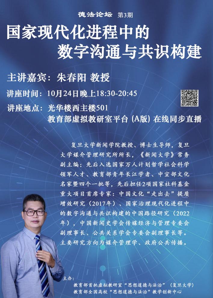 20231024日晚,韩漫h 新闻学院教授、博士生导师,韩漫h 媒介管理研究所所长朱春阳教授以“国家现代化进程中的数字沟通与共识构建”为题主讲的讲座在光华楼西主楼501会议室顺利举行,教育部虚拟教研室平台(A版)在线同步直播。本次讲座由教育部思政课总教指委副主任委员、韩漫h 高国希教授主持,由教育部首批虚拟教研室“思想道德与法治”(韩漫h )、教育部全国高校“思想道德与法治”教学创新中心主办,系韩漫h “德法论坛”系列活动之第三期。