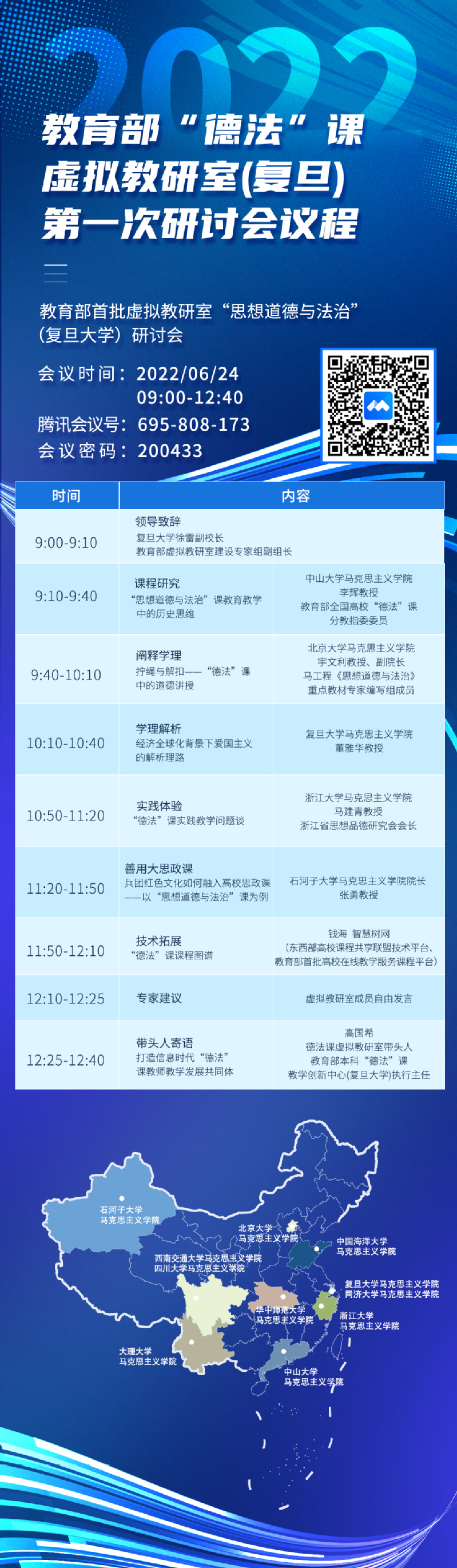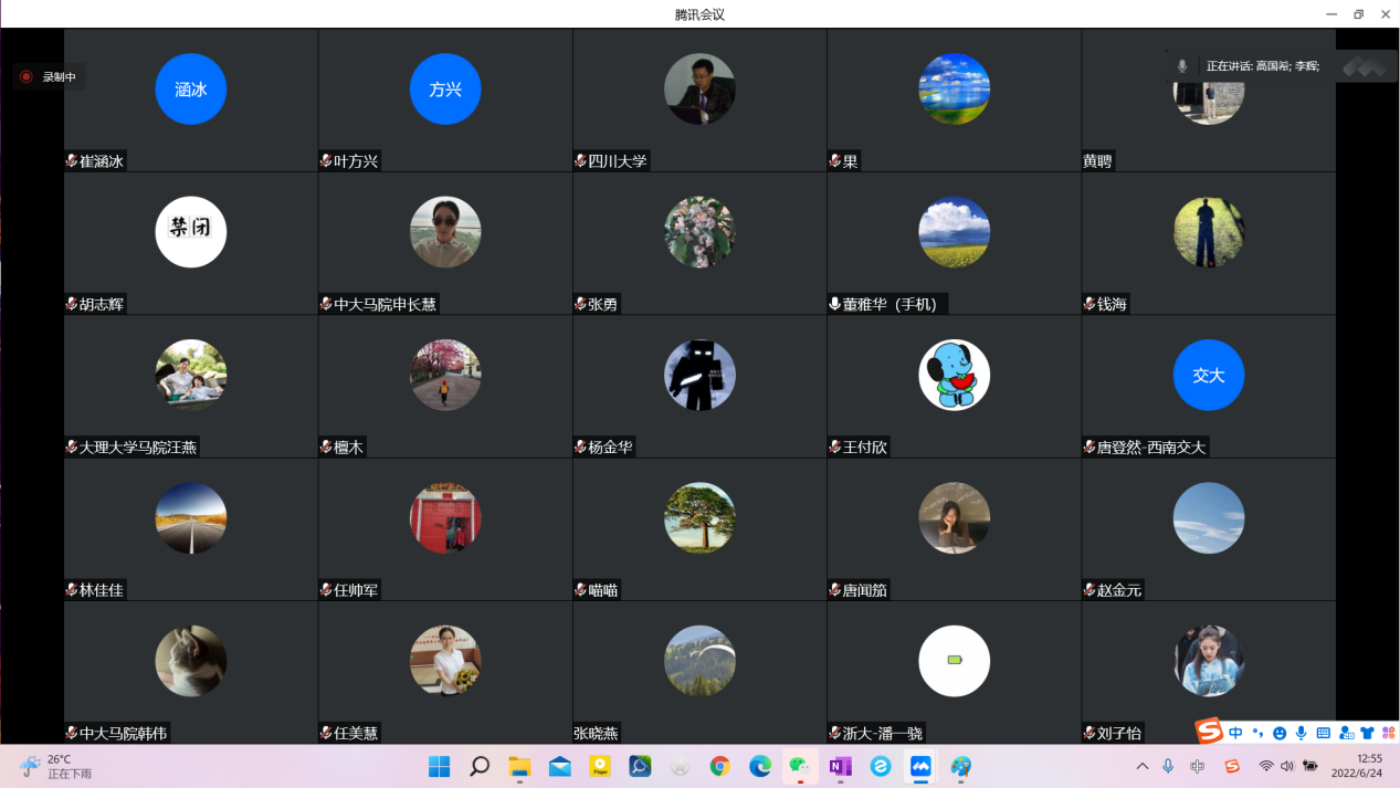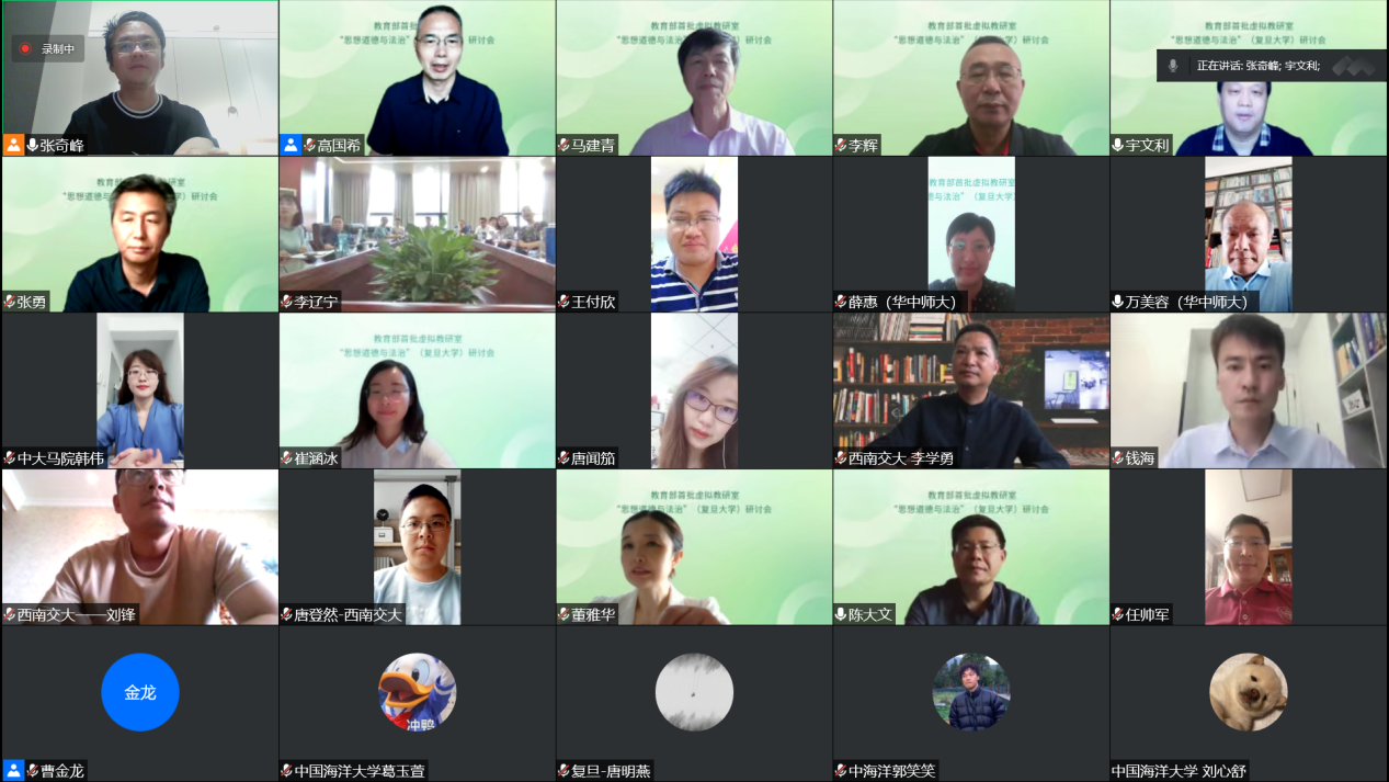 2022624日,教育部首批虚拟教研室建设试点韩漫h “思想道德与法治”虚拟教研室第一次研讨会通过线上会议的方式顺利召开。来自虚拟教研室成员单位北京大学、浙江大学、中山大学、四川大学、西南交通大学、华中师范大学、中国海洋大学、石河子大学、大理大学等高校韩漫h 的50余位专家学者出席了会议。本次研讨会以“德法”课教学的课程研究、学理阐释和实践解析为脉络,基于现代信息技术,对虚拟教研室该如何在全媒体时代进行改革、创新与建设开展交流与讨论。